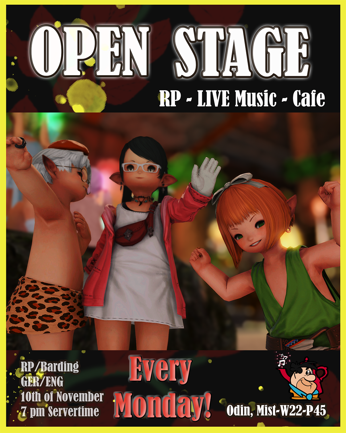 The Flintstones are an old-established family from Limsa. It was a very long time ago, around the Stone Age, that the Flintstones lived in the Rocks on which present-day Limsa is built. Now they run a music cafe and how could it be otherwise, in Limsa's residential area MIST - Ward 22 Plot 45, Odin-light.A warm family invites you for coffee, cake and of course lots of cookies.Music plays an important role for them and so they like to play for their guests, whether as a duo or as an octet. But the Flintstones also invite others to perform. Be it as a single performer or as a band.Everyone is welcome!